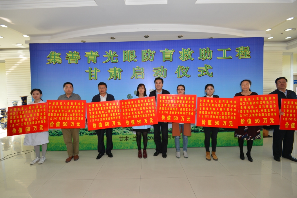 在第二十七個全國助殘日來臨之際,為幫助我省貧困青光眼和高眼壓癥患者解除病痛、恢復(fù)視力、降低致盲率,推動防盲治盲工作,中國殘疾人福利基金會、北京萬升康達經(jīng)貿(mào)有限公司在我省實施集善青光眼防盲救助工程,捐贈價值1500萬元的30臺美國PNT無創(chuàng)青光眼治療設(shè)備。5月12日上午在蘭州舉行救助工程甘肅啟動儀式。中國殘聯(lián)副理事長賈勇、省政協(xié)副主席李沛文、民建中央辦公廳副主任李建國、中國殘疾人福利基金會副秘書長沈偉俊、北京萬升康達有限公司董事長楊外生,省政府副秘書長郭春旺,省殘聯(lián)黨組書記、理事長華文哲,省殘疾人福利基金會理事長朱雪明、副理事長高世成、楊清友和省衛(wèi)計委業(yè)務(wù)負責(zé)人出席了儀式。受贈殘聯(lián)及醫(yī)院負責(zé)人、醫(yī)務(wù)人員,共100多人參加了啟動儀式。