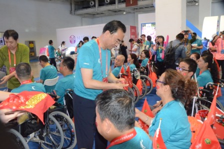 蘭馬賽早上8點(diǎn)30分,主辦方領(lǐng)導(dǎo)中國(guó)殘疾人福利基金會(huì)宣傳活動(dòng)部副部長(zhǎng)常達(dá),蘭州市委副書(shū)記、市長(zhǎng)張偉文和北京中跡體育管理有限公司總顧問(wèn)張思杰,承辦方領(lǐng)導(dǎo)甘肅省殘聯(lián)黨組成員、副理事長(zhǎng)蔣錄基和省殘聯(lián)副主席、殘疾人福利基金會(huì)理事長(zhǎng)朱雪明,在蘭馬賽主席臺(tái)鳴槍并參加賽跑。隨著發(fā)令槍響,參賽殘疾人和陪跑員一同沖過(guò)起點(diǎn),開(kāi)始1公里的征程,沿途觀眾激情地送上熱烈的掌聲和歡呼聲,向殘疾人運(yùn)動(dòng)員表示了深切的關(guān)愛(ài)和祝福。來(lái)自四川汶川“斷腿自救女孩”黃思雨專(zhuān)程從四川趕來(lái)參加了比賽。省殘聯(lián)黨組成員、副理事長(zhǎng)曾占奎,省殘疾人福利基金會(huì)副理事長(zhǎng)楊清友等20名殘疾人工作者參加了此次活動(dòng)。